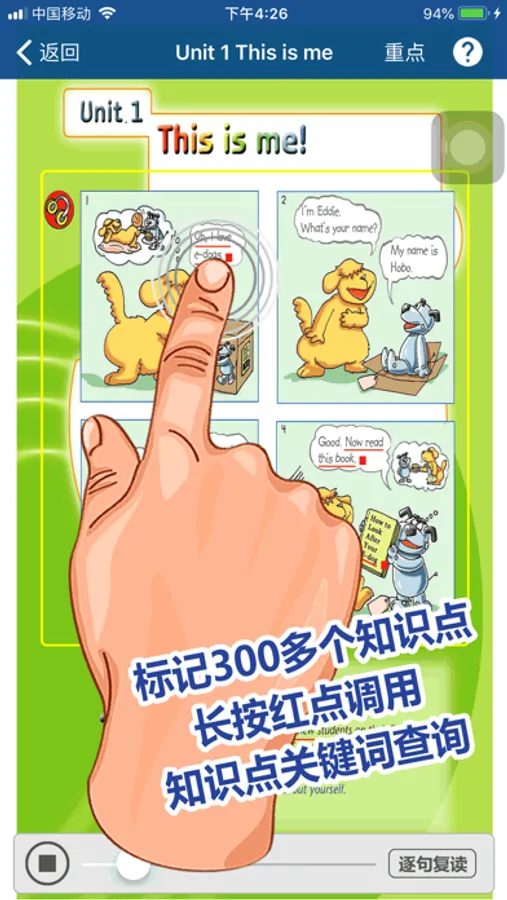 点读功能:和课本同步原音发音,点击即可播放。并提供全文翻译。课文每句话都可以独立复读。
