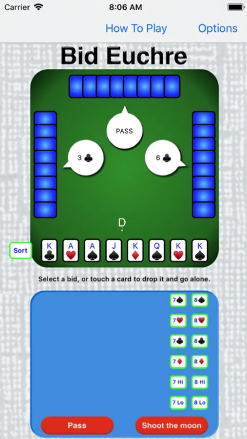 Play Bid Euchre against three A.I. participants. This solitaire game is the 32-card, double deck version. Instructions for playing and some bidding options are provided.