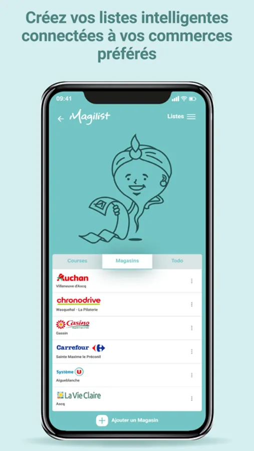 Magilist est connectée à plus de 15 000 magasins: pour ajouter vos magasins préférés, choisissez simplement vos Hypers-supers-drives habituels ou autres magasins dans les listes.