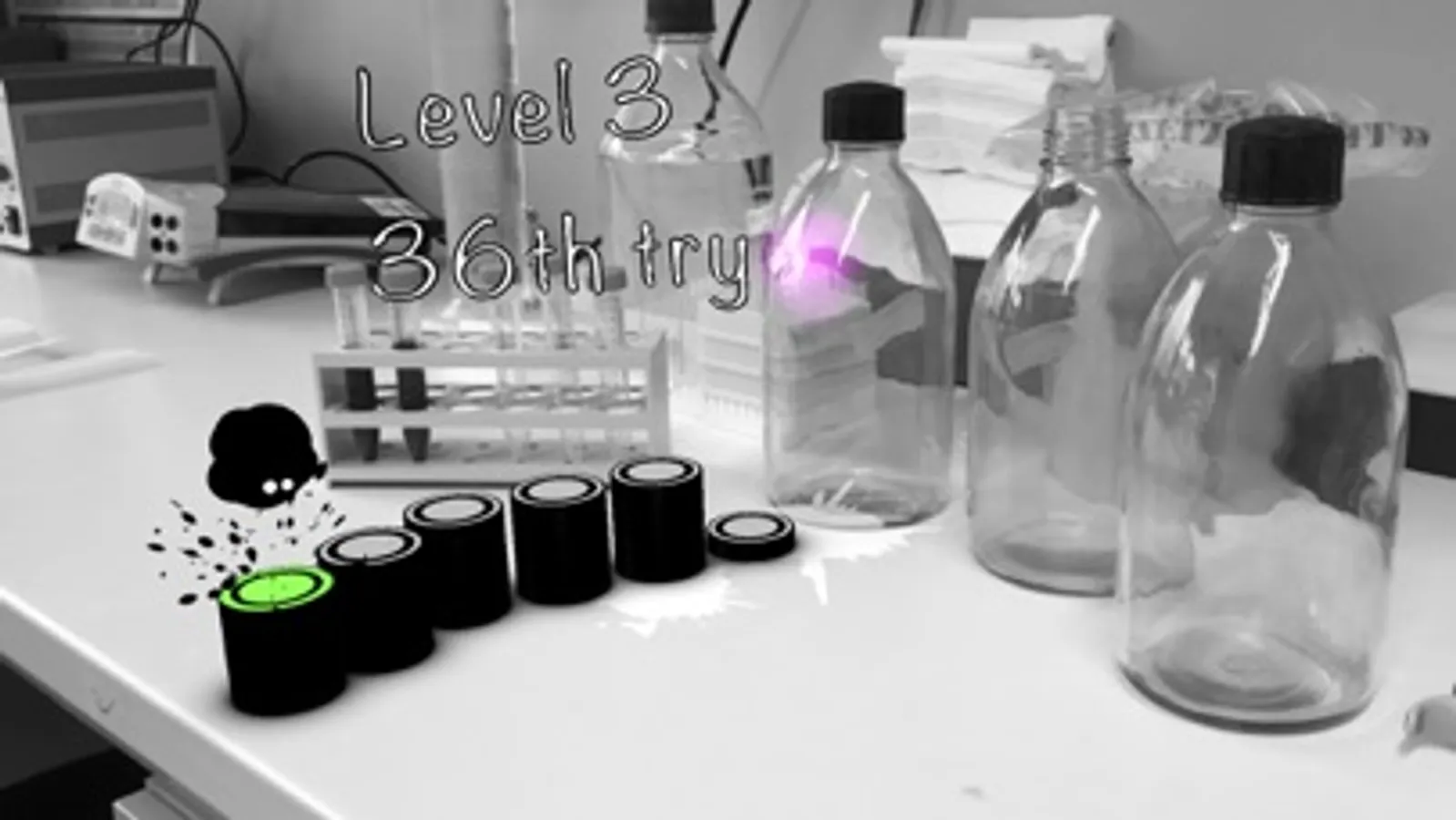只要经受得住1分钟的动次打次即可完成一个关卡,且游戏恶趣味地设置了失败次数的提示,时刻提醒玩家不要放弃的原则。十个关卡的挑战看起来似乎也是不难的!但不幸的是本作与自虐鸟——《flappy bird》“师出同门”,玩的就是一条命,能否再一分钟内保住这颗小墨点的旅程就掌握在每个音乐大神手中了!