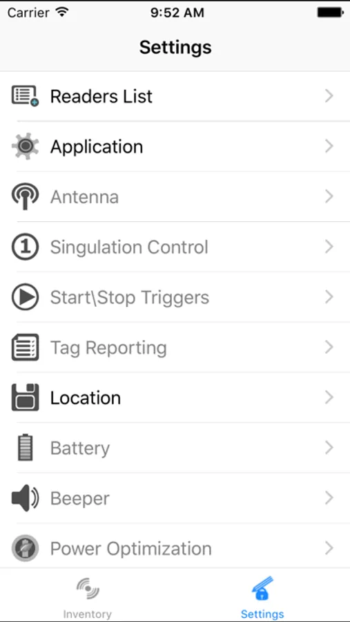 2.Settings-Settings can be used to modify the behavior of the reader. Among the list of settings that can be manipulated are Reader connectivity, if paired with more than one RFD8500, store location, start and stop triggers, as well as beeper volume.