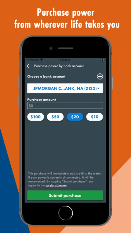 Purchases: Reload your account quickly and securely from anywhere. Payments can be made with your checking account and will be credited to your meter automatically. If you’d like to make an in-person cash payment, you can access your digital cash payment card through the app.