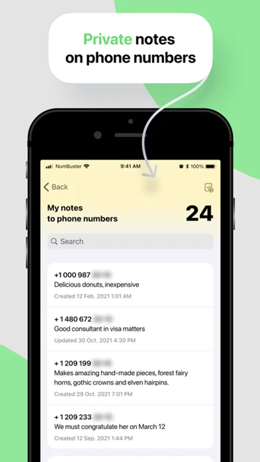 - Access to ALL NumBuster data about phone numbers is possible ONLY through the search bar by number within the app or when you use the function “share contact in NumBuster” from your call log in iPhone