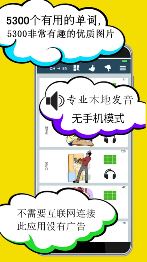 The only picture vocabulary app with 2 native spoken audio-languages, played one after the other!