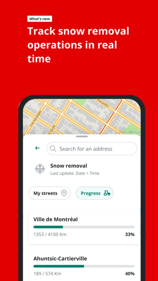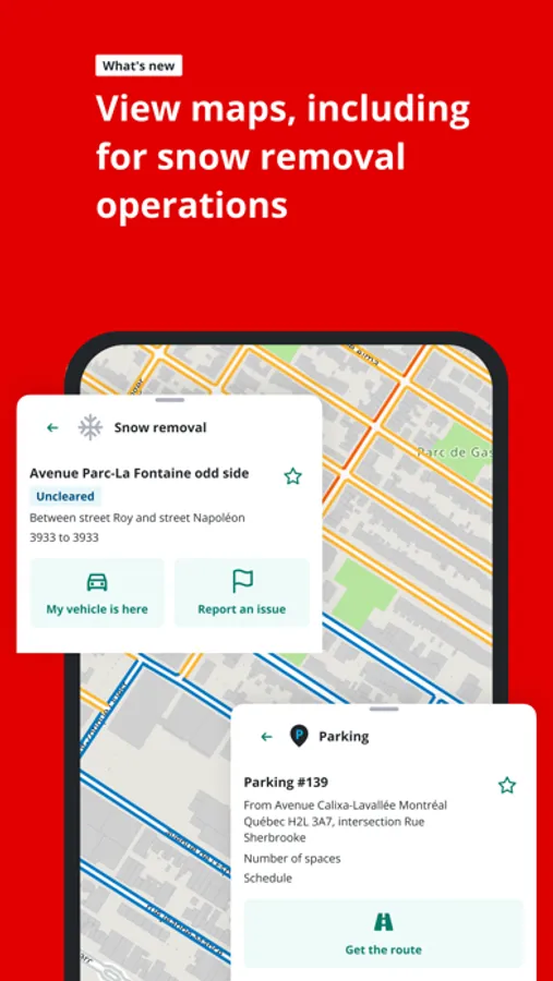 View maps, including those for snow removal and incentive parking during snow operations. Get notifications for your street sections or save your vehicle's location so you know when to move it.