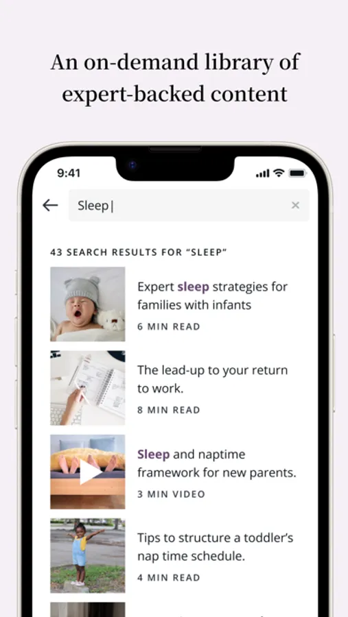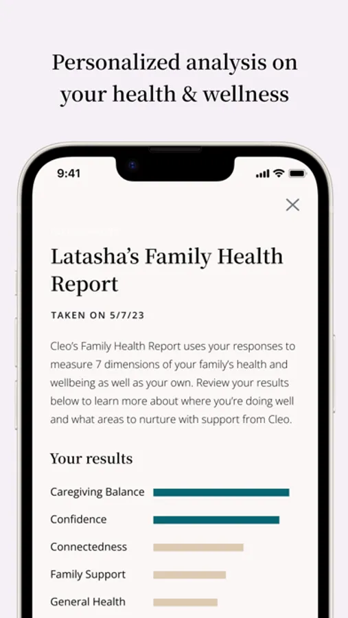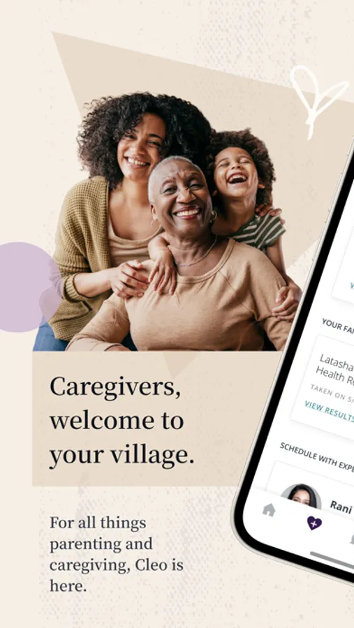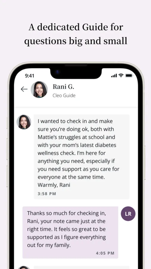 One-on-one expert support. Upon signing up, you will be paired with a Cleo Guide, a trained and certified expert (a real human!), ready to answer your questions and support you through the ups and downs of parenting and caregiving. You can message your Guide at any time and schedule live sessions with them to discuss any caregiving topics or issues you may be facing.
