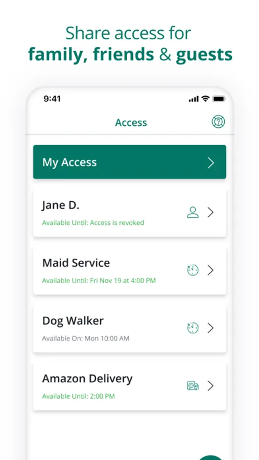 - Grant unique, time-bound access codes to family, friends, and service providers