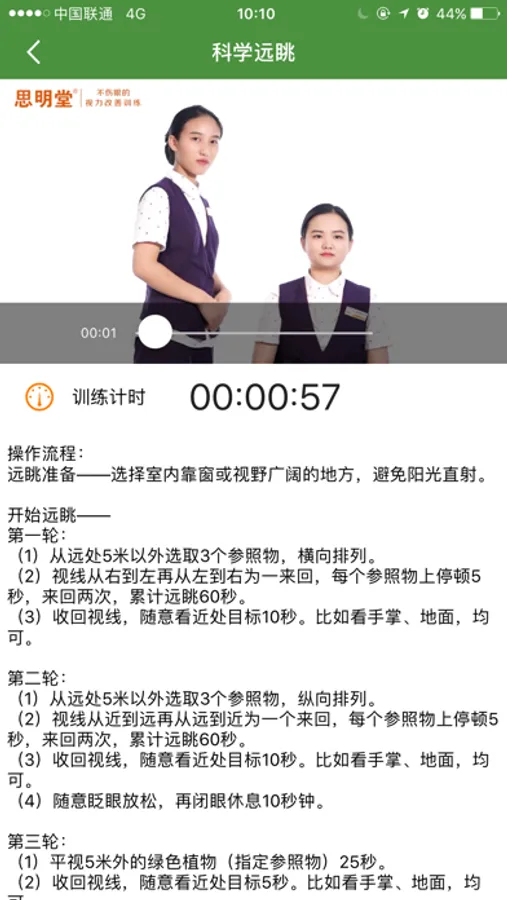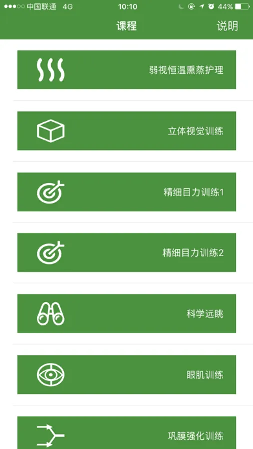 弱视训练体验版:每个课程步骤体验时长为一分钟,用户根据视频示范、语音指导,进行一套改善视力课程体验。训练课程如下——