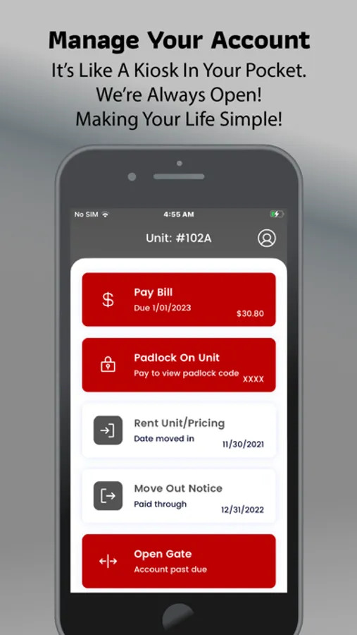 • New customers can rent a unit and move in within minutes. Access code to gate will be provided on screen at the completion of the rental.