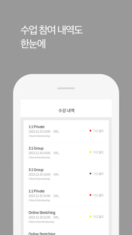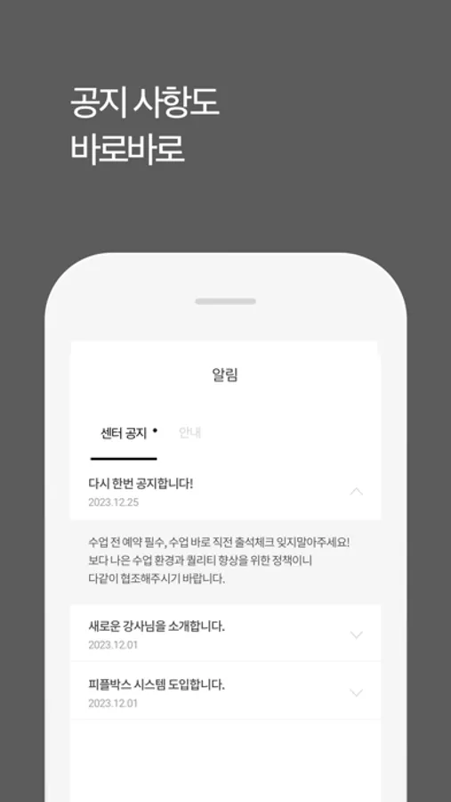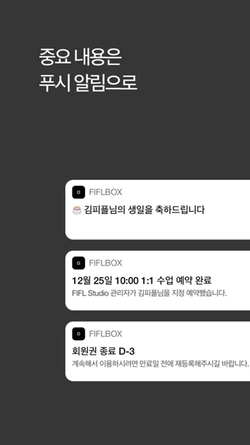 - 자동 푸시 알림 무료 전송 (회원권 만료, 공지사항, 수업 리마인드, 홀딩, 대기)