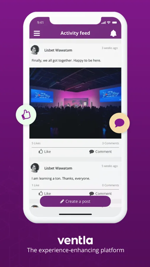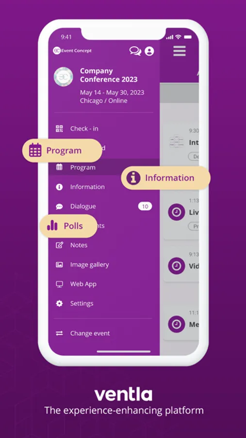 The Ventla app enables attendee participation, engagement, and interactivity in any place and space — virtual, in‑person, or in‑between. The entire event in your pocket. A bit‑size wonder.