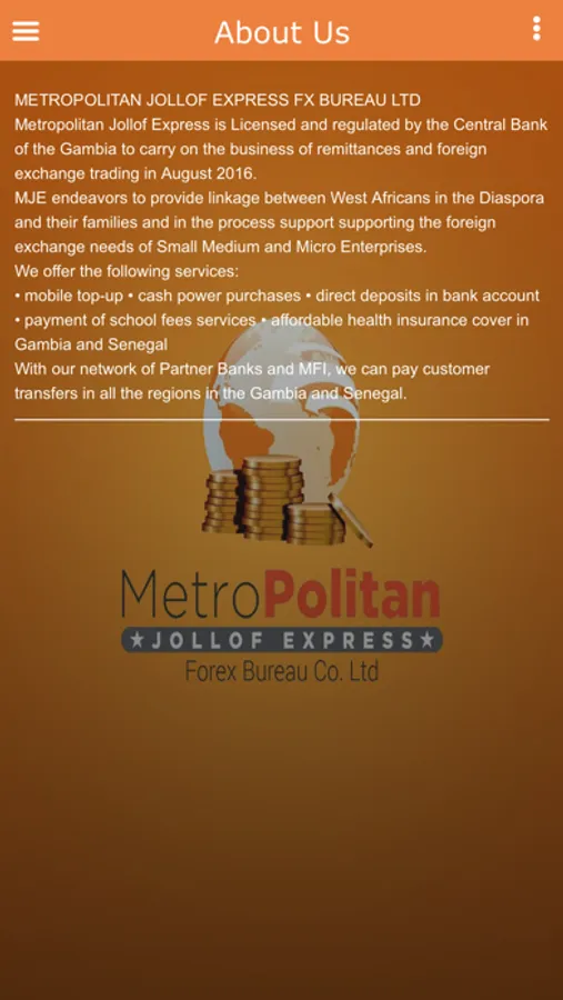Metropolitan Jollof Express is Licensed and regulated by the Central Bank of the Gambia to carry on the business of remittances and foreign exchange trading in August 2016.