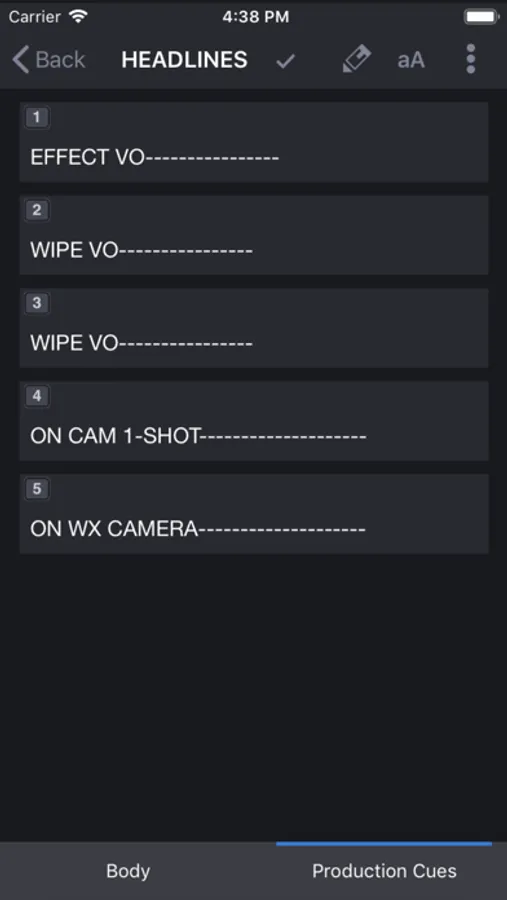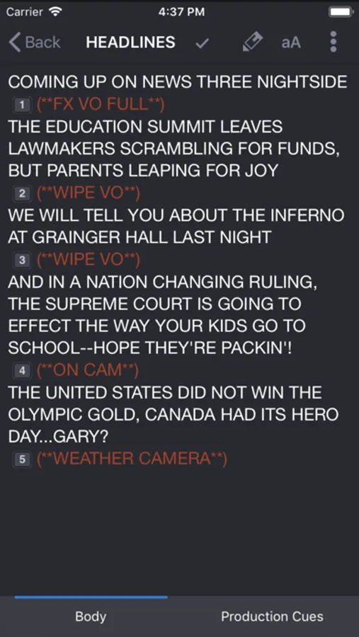 · Stories include normal text, presenter text, close captioned text, production cues, and script templates