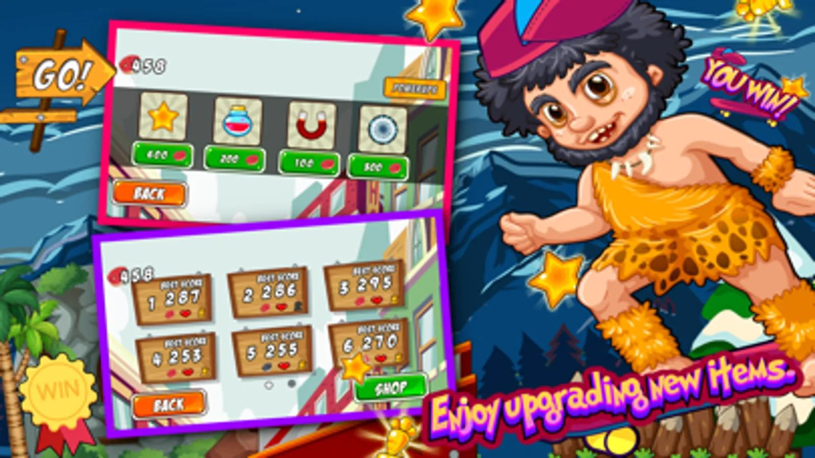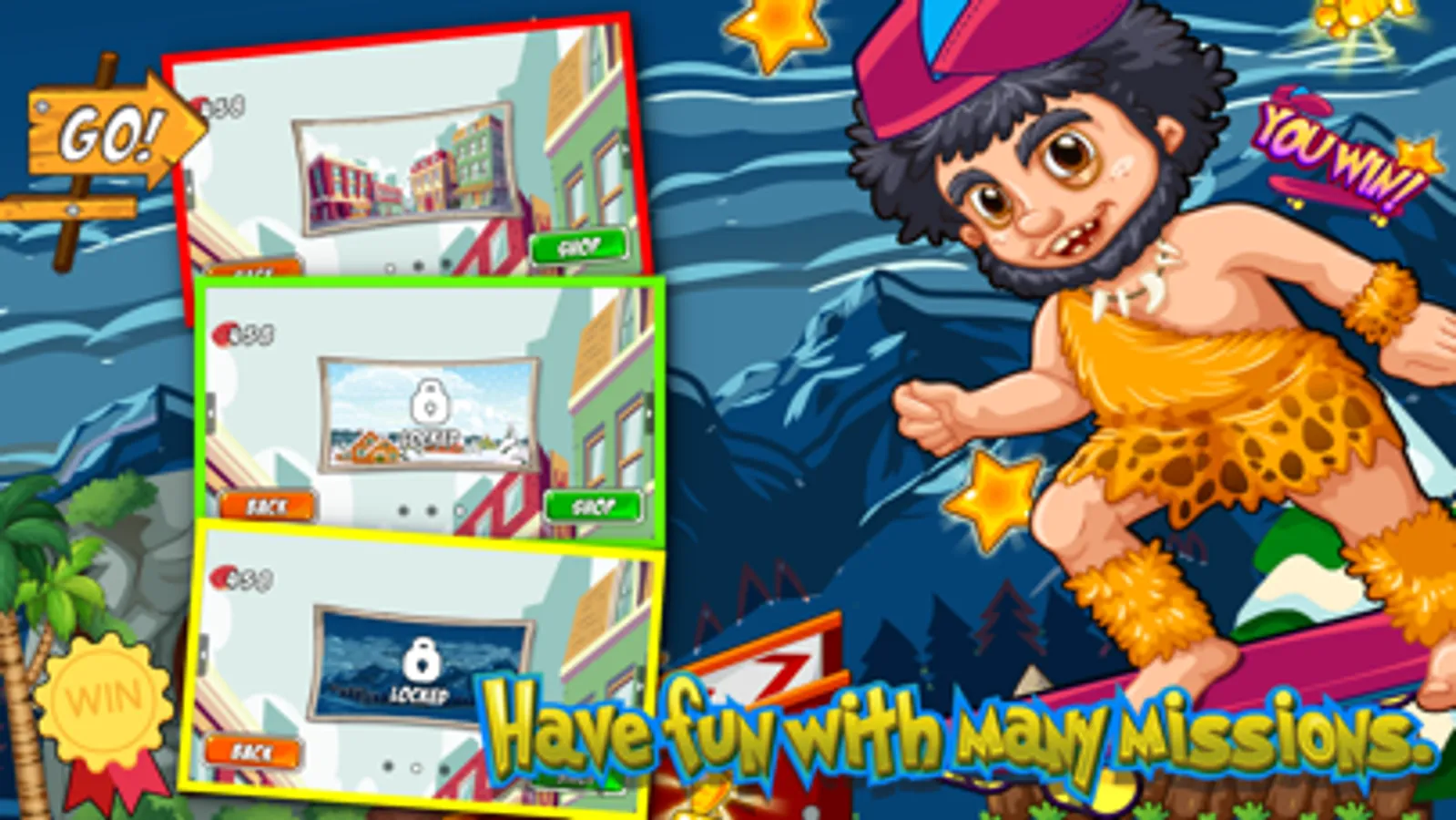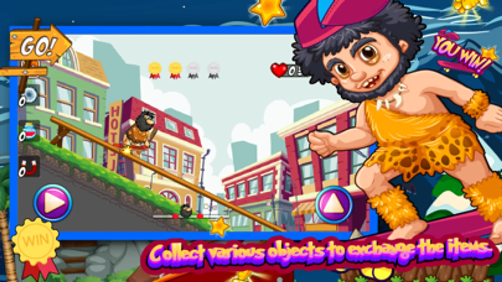 your inner caveman. The player must control. Humans are on a skateboard and run forward. To complete the mission Players must collect trophies. Complete and find all the items to complete the assignment of the game, the player must jump off. Obstruction And not to collide with Things in front Remember that the player has a chance to hit 3 only. Players can collect meat to upgrade items.