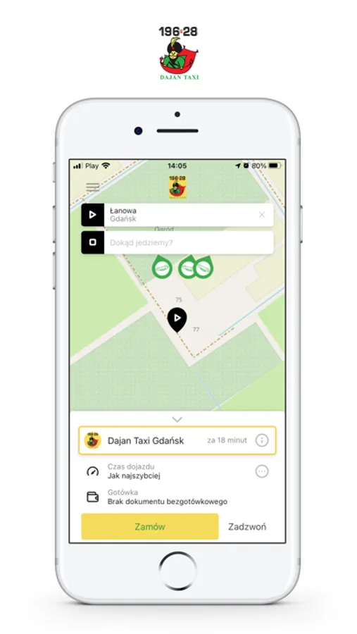 Aplikacja mobilna Dajan Taxi to projekt przygotowany pod kątem ludzi, którzy lubią posługiwać się nowymi technologiami w codziennym życiu. Od dziś nie musisz już szukać numeru telefonu, opuszczać ważnego spotkania, aby wcześniej zamówić taksówkę na wybraną godzinę, zastanawiać się nad adresem pod jaki ma podjechać po Ciebie taksówka. Te i tym podobne zmartwienia odchodzą powoli "do lamusa". Komfort obsługi, łatwość i prostota nawigacji oraz wybór preferencji znakomicie oddają ducha korporacji. Tuż po włączeniu aplikacji, w pierwszej kolejności pokazuje nam się ekran, na którym widać poruszające się po mapie punkty, odpowiadające taksówkom poruszającym się w rzeczywistości w danych miejscach miasta. Dzięki temu możemy zaobserwować jak daleko od miejsca naszego położenia znajduje się najbliższa taksówka. Decydując się na zamówienie taksówki możemy posłużyć się wbudowanym w nasze urządzenie mobilne modułem GPS, aby wskazać miejsce naszego położenia jako miejsce, w które ma przyjechać taksówka, albo możemy ręcznie wpisać dowolny, wybrany przez siebie adres. W celu finalizacji, aby przejść do dalszych kroków należy wybrać przycisk znajdujący się u dołu ekranu po jego lewej stronie, z napisem "zamów". Możemy również skorzystać z alternatywnej, tradycyjnej metody, wybierając przycisk "zadzwoń", aby połączyć się telefonicznie z dyspozytorem na centrali Dajan Taxi.