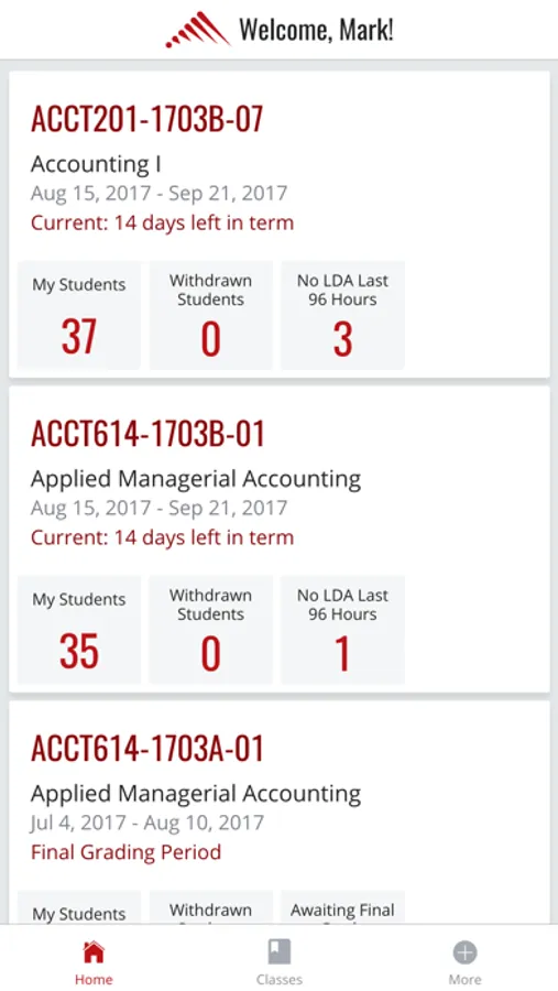 - A homepage that provides essential information regarding each course, such as number of students registered, and number of students who have not updated their LDA in 96 or more hours