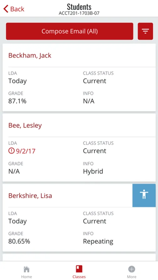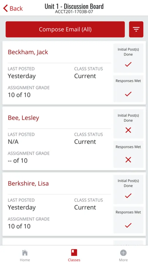- Messaging capabilities, including options to message the entire roster, filtered groups of students, or a single student depending on need.