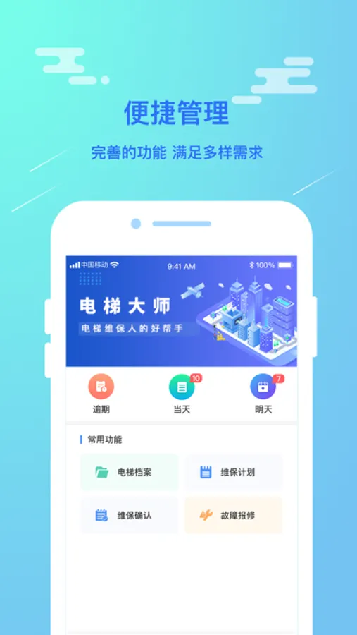 电梯大师-物业版,是深圳市卓越信息技术有限公司为有效管理电梯维保工作、实现无纸化维保而打造的一款电梯维保管理软件。专供物业公司使用,可查看电梯档案、维保情况,以及进行故障报修,方便物业公司实时了解电梯的维保检验情况,实现电梯急修一对一便捷高效服务。