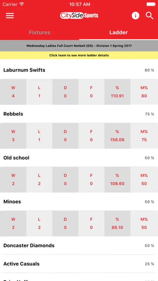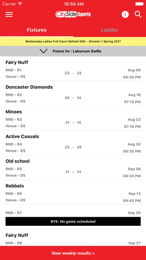 The CitySide Sports app is for use by players of CitySide Sports Pty Ltd, allowing users to have quick view of their team fixtures, results and ladders. Game time reminders can be sent. More features will be added that will allow teams to register for upcoming seasons and tournaments, track team payments and team message boards.
