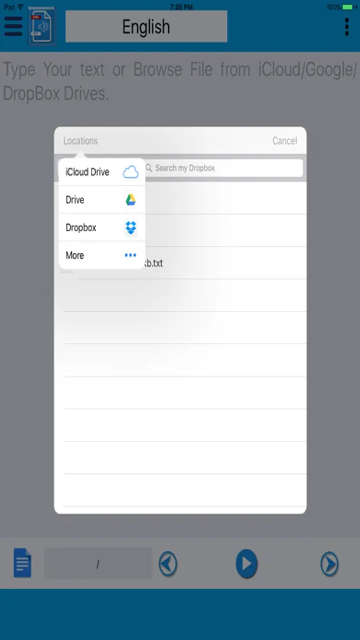 -Read TXT and PDF files from iCloud/Google/Dropbox Drives.