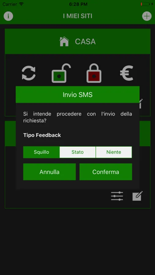 Nella schermata principali hai la possibilità di accedere ad alcune scorciatoie per l'attivazione e disattivazione totale del sistema di allarme, la richiesta del credito residuo (in caso di SIM prepagate), la richiesta di stato.