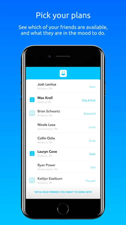 ● View a list of your friend's that are also free. Long press on a name to request them, if they also request you, you will see a blue smiley face icon. Tap on the name again to start messaging them.