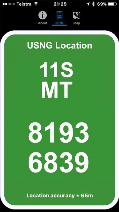 MyUSNG reports the location of your device in US National Grid format (USNG). With a single tap on the screen, you will copy the USNG location into your clipboard. With a tap and hold, you can easily e-mail your USNG location.