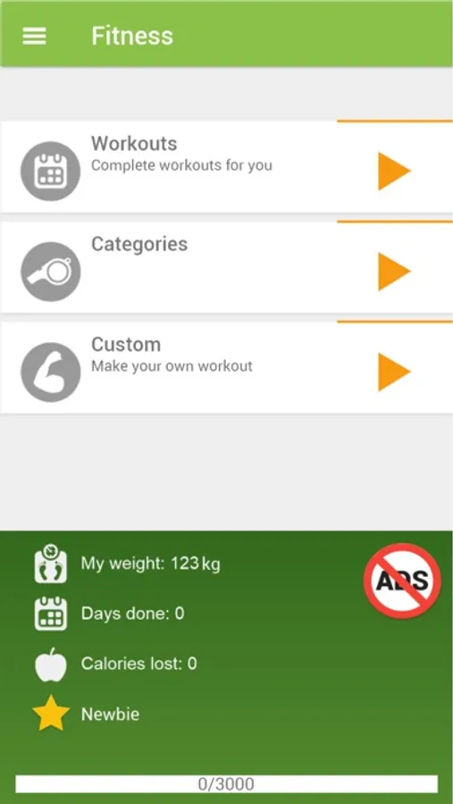- the main screen displays the current statistics: your weight, past workouts, burned calories, your status