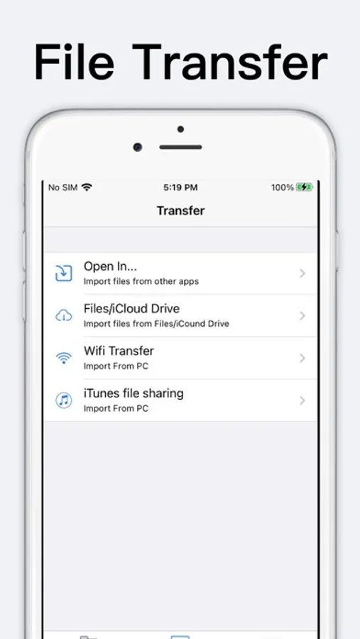 1. USB transfer (iTunes File Sharing, upload and download files)