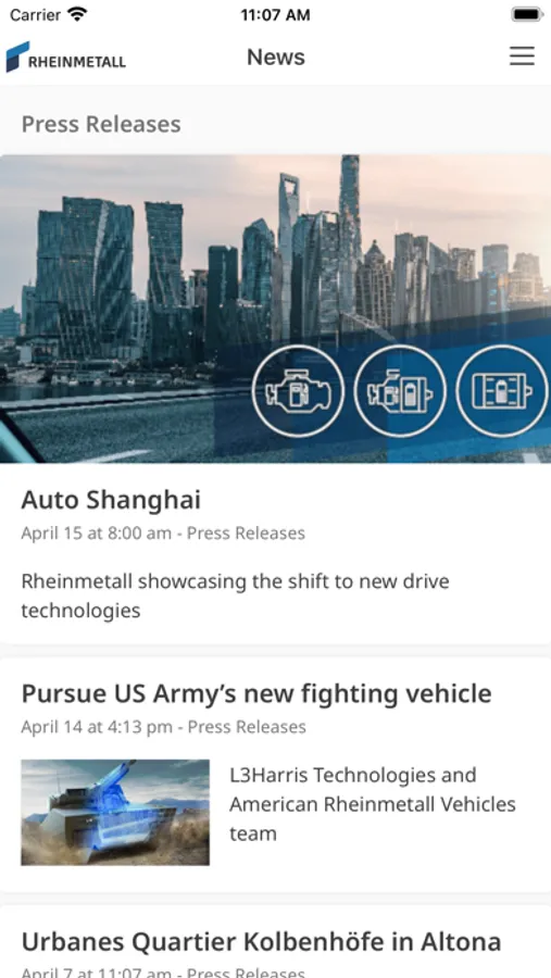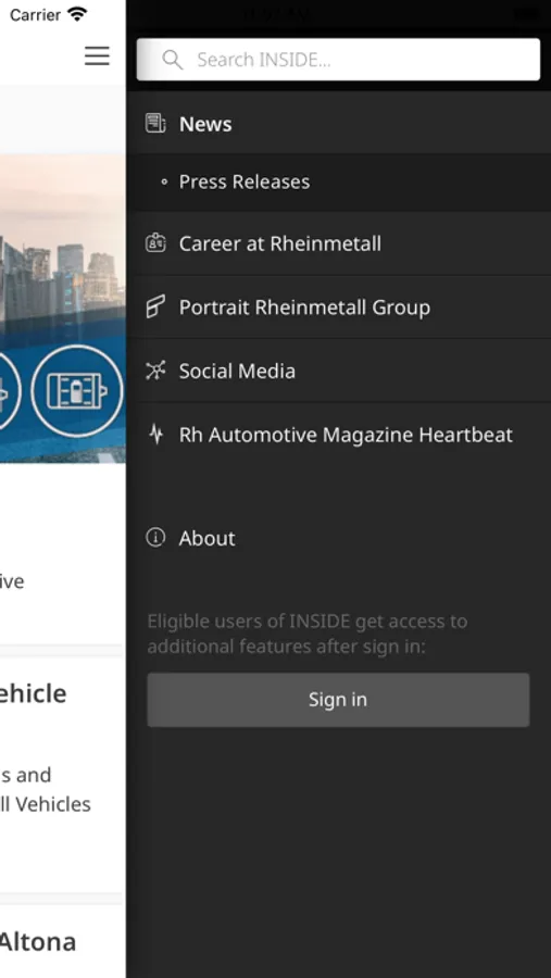 The Rheinmetall INSIDE app offers news and information about Rheinmetall. In addition to a company portrait, you will find current press releases. The app also provides access to the Rheinmetall career portal as well as Rheinmetall's social media channels. After logging in, additional functions are available to authorised users.