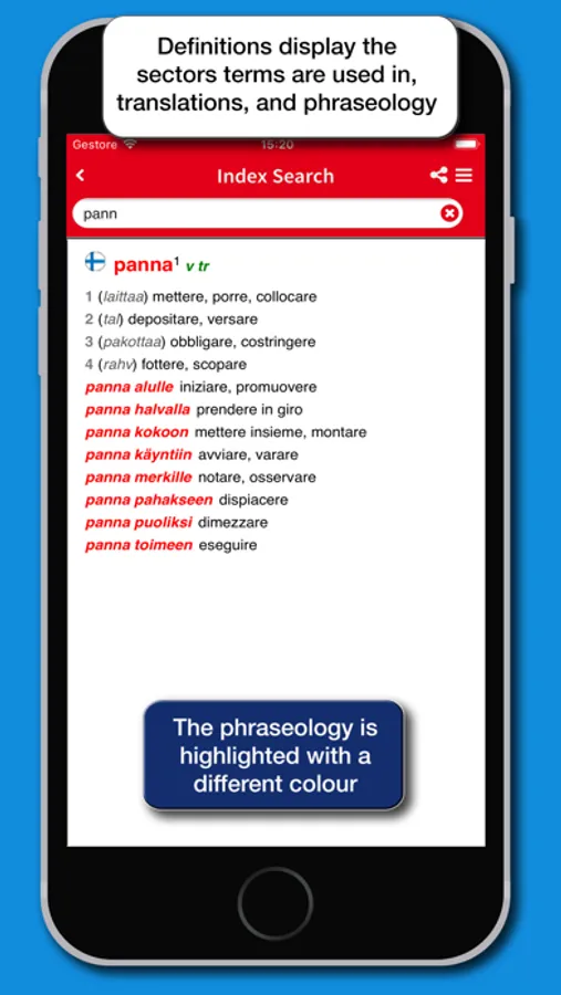 In addition to the search in the broad wordlist, the app allows you to run full-text searches and provides a useful option to search the phraseology providing for a real context of the spoken language, and making the dictionary a useful tool for quick reference as well as a safe and practical language guide for both idioms