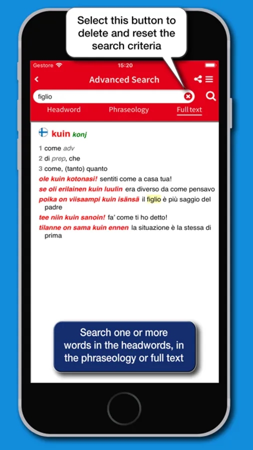 • Advanced search: lets you search for headwords, in the phraseology, and in full text