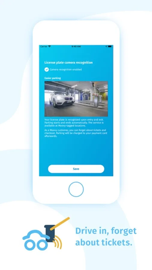 • As a Moovy customer, in parking garages you drive in and out without cards, tickets or queuing at checkouts.