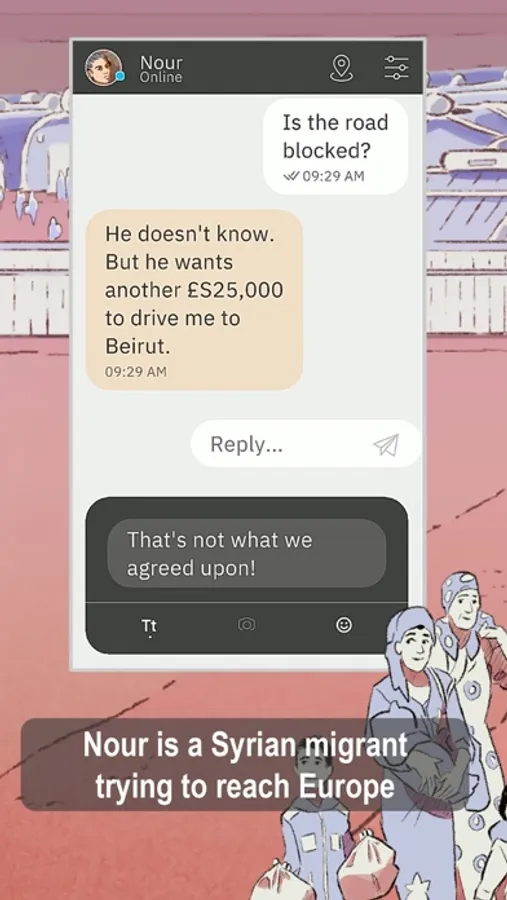 By reading instant messages and choosing response options, players help Nour overcome the hardships she will encounter.