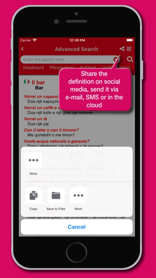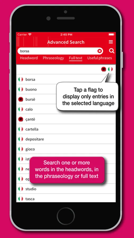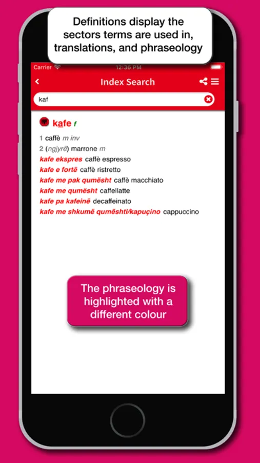 In addition to the search in the broad wordlist, the app allows you to run full-text searches and provides a useful option to search the phraseology providing for a real context of the spoken language, and making the dictionary a useful tool for quick reference as well as a safe and practical language guide for both idioms