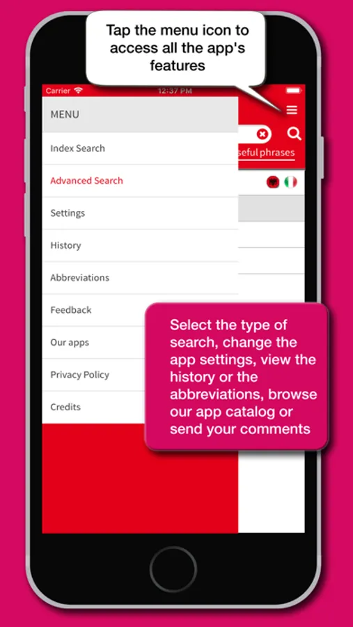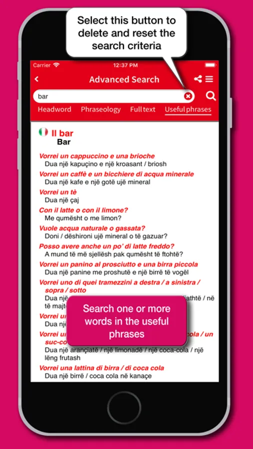 A useful phrases search option further contributes to the learning of the language providing the building blocks for a quick orientation in the most common situations and places: from greetings to presentations, from the bar to the restaurant, from emergency situations to public transportation as well as all the useful phrases for tourists.