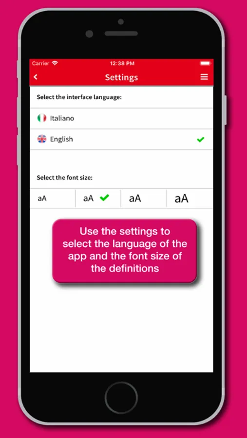 • Settings: allows you to choose the font size of the definitions and the language of the interface