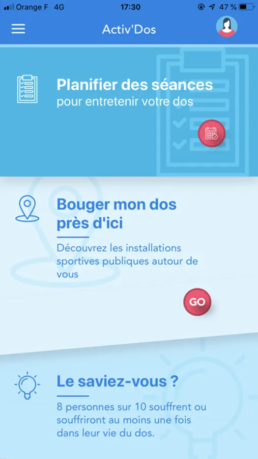 Activ’Dos a été créée par l’Assurance Maladie pour vous aider à prendre soin et à préserver votre dos au quotidien. Pour cela, l’application propose plusieurs fonctionnalités.