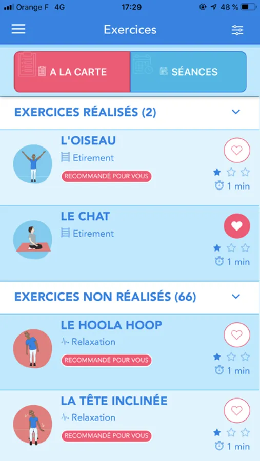 Découvrez des exercices bénéfiques pour votre dos, sous forme de vidéos, proposés à la fois individuellement « à la carte » et sous forme de « séances » constituées de plusieurs exercices. Vous pouvez également composer vous-même votre séance d’exercices. Planifiez des rappels pour vous aider à tenir le bon rythme. Triez vos exercices ou vos séances selon 3 critères : niveau de difficulté (1 à 3 étoiles), type d’exercice (étirement, musculaire, relaxation), exercice réalisable au travail.
