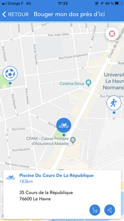 Avec ou sans géolocalisation activée, trouvez les équipements sportifs près de vos lieux habituels (travail, domicile…) pour faire bouger votre dos : parcs, stades, terrains de sports, piscines, à l’extérieur ou en intérieur… Et partagez ces adresses avec vos amis pour préserver ensemble la santé de votre dos.
