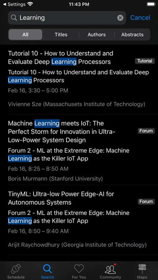 * Search through the entire technical program, by searching for session titles, talk titles, abstracts, and author names