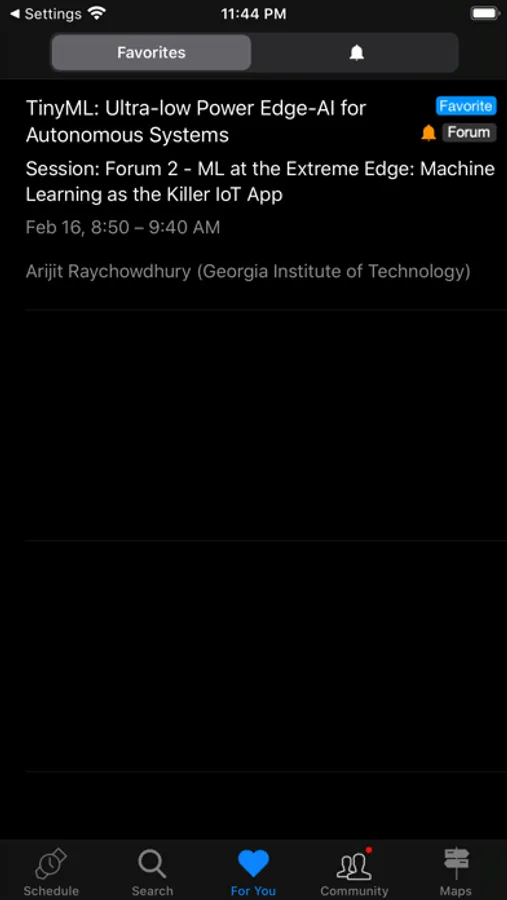 Ever wished for a reminder before an interesting talk? In addition to the features above, you can also schedule reminder notifications for up to 64 talks in the conference. When a reminder arrives, you may force touch it and press "Snooze" to reschedule it to five minutes later.