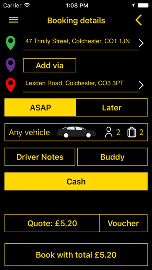 Welcome to Roman Cars Colchester. Using our App you will be able to - Make a booking - Check its status - Track the vehicle in real time - See all available cars near you - Choose vehicle type eg saloon, estate, 6/8 seaters and Executive cars - Manage your booking (make, edit, cancel) - Manage previous or favourite bookings - Get ETA on ASAP bookings - See Driver details - Add aditional pick-ups to your booking - Have a message automatically sent to a 'Buddy' when your car arrives so they can track where you are - Receive an email confirmation on each booking - Pay by Cash or Card .