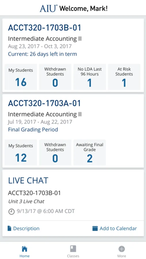 The AIU Mobile app provides faculty facilitating online and at ground campuses an opportunity to connect with students and course content: