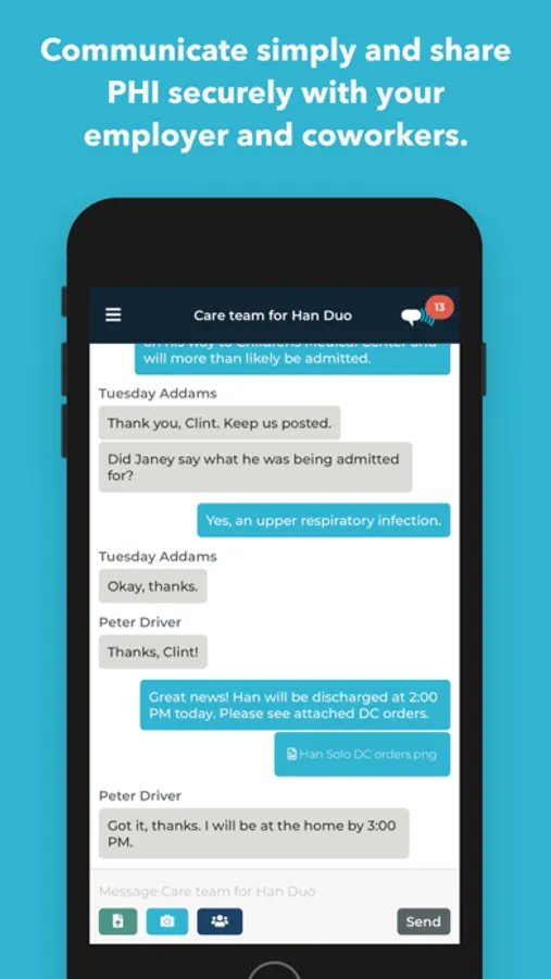 Secure communication for your nurses, schedulers, and back office that feels like texting. Our HIPAA compliant app enables employees to communicate, share documents, and take images and videos right from their phones and desktop.