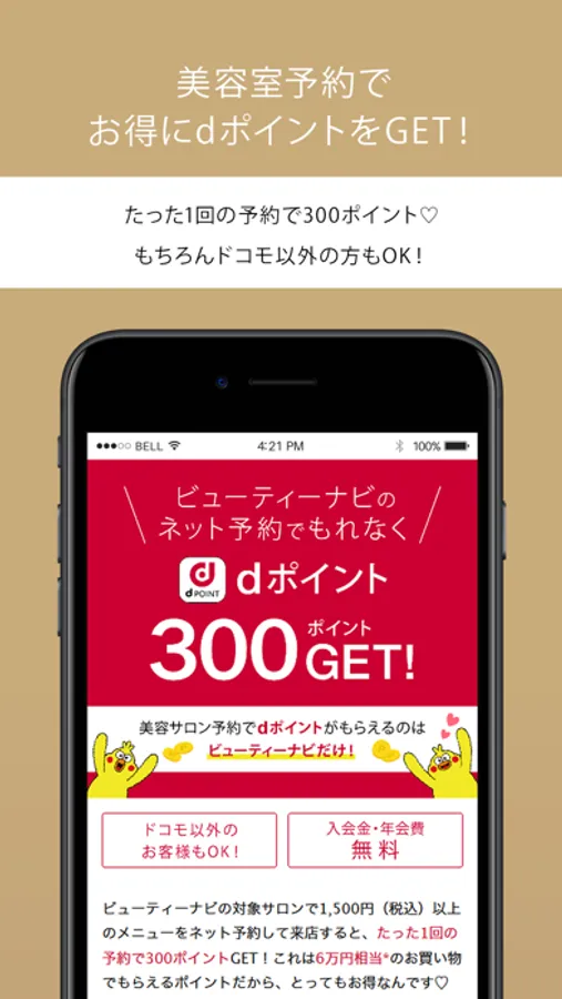 対象サロンで1,500円(税込)以上のメニューをネット予約して来店すれば、dポイントを300ポイントGETできます!たった1回の予約で6万円相当のポイントがもらえるからかなりお得!