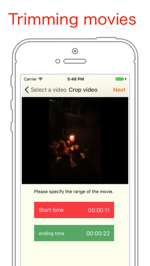 - You can trim movies in the specified range by selecting trimming on the top screen, selecting a movie by album or camera shooting, and specifying the range (playback start time / playback end time) you want to trim the movie.