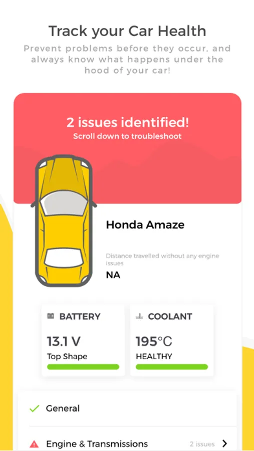 3. Vehicle Health Monitoring: Real time view of engine health and get notified if there is an issue with a detailed explanation of the problem