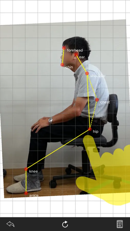 Move the red marks to the positions shown below. If the line connecting the ear, shoulder, chest and hip is straight, your posture is generally said to be quite good.