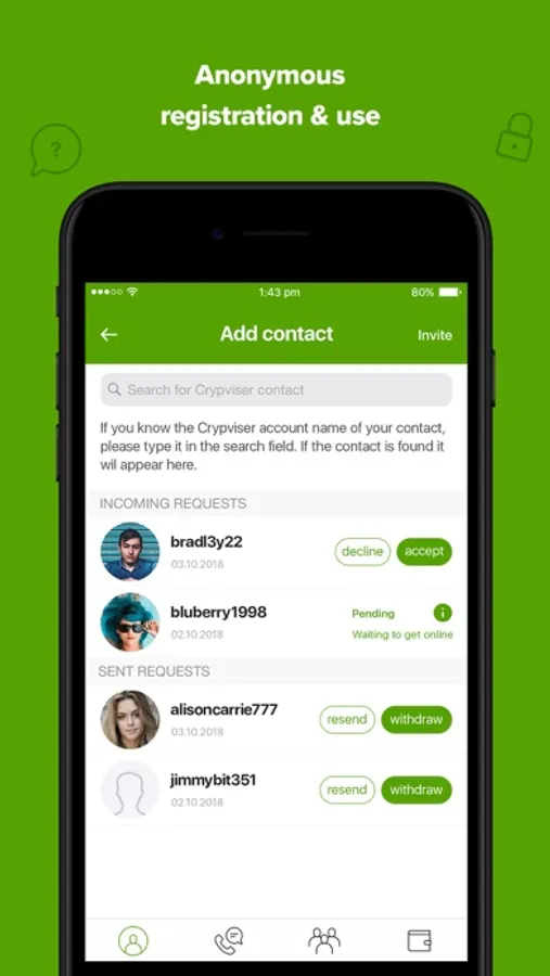 One of our core features is, that only you should decide which text message is to be made public and which isn´t. Crypviser is the unique secure chatting app which doesn't require your phone number or perform SMS verification.